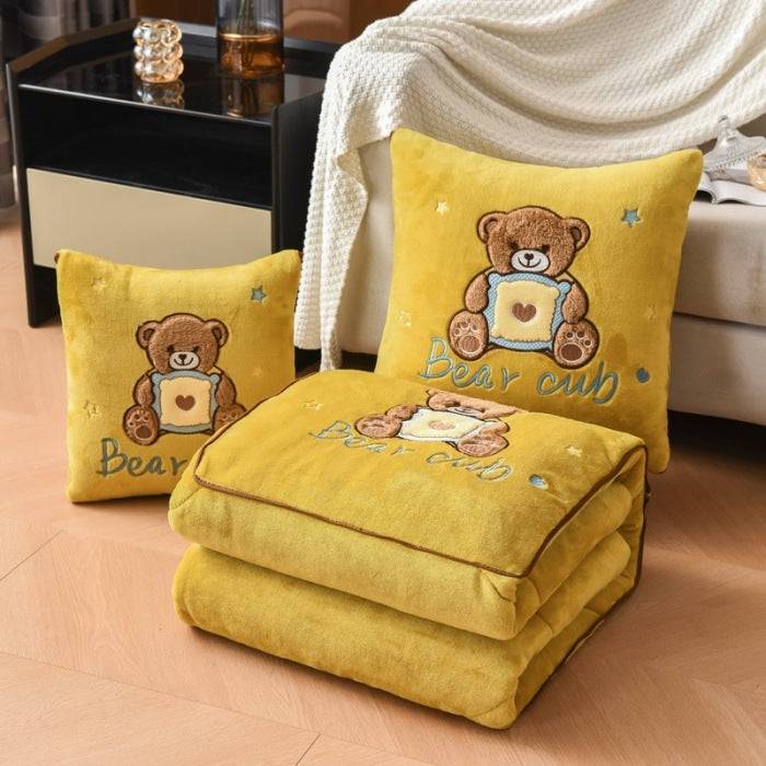 The adorable bear cub embroidery adds a playful and cozy charm, making it a great gift for kids and adults alike. Crafted from premium milk fiber fabric, this pillow blanket offers a smooth, velvety feel that keeps you warm during chilly nights and relaxed during any season.
