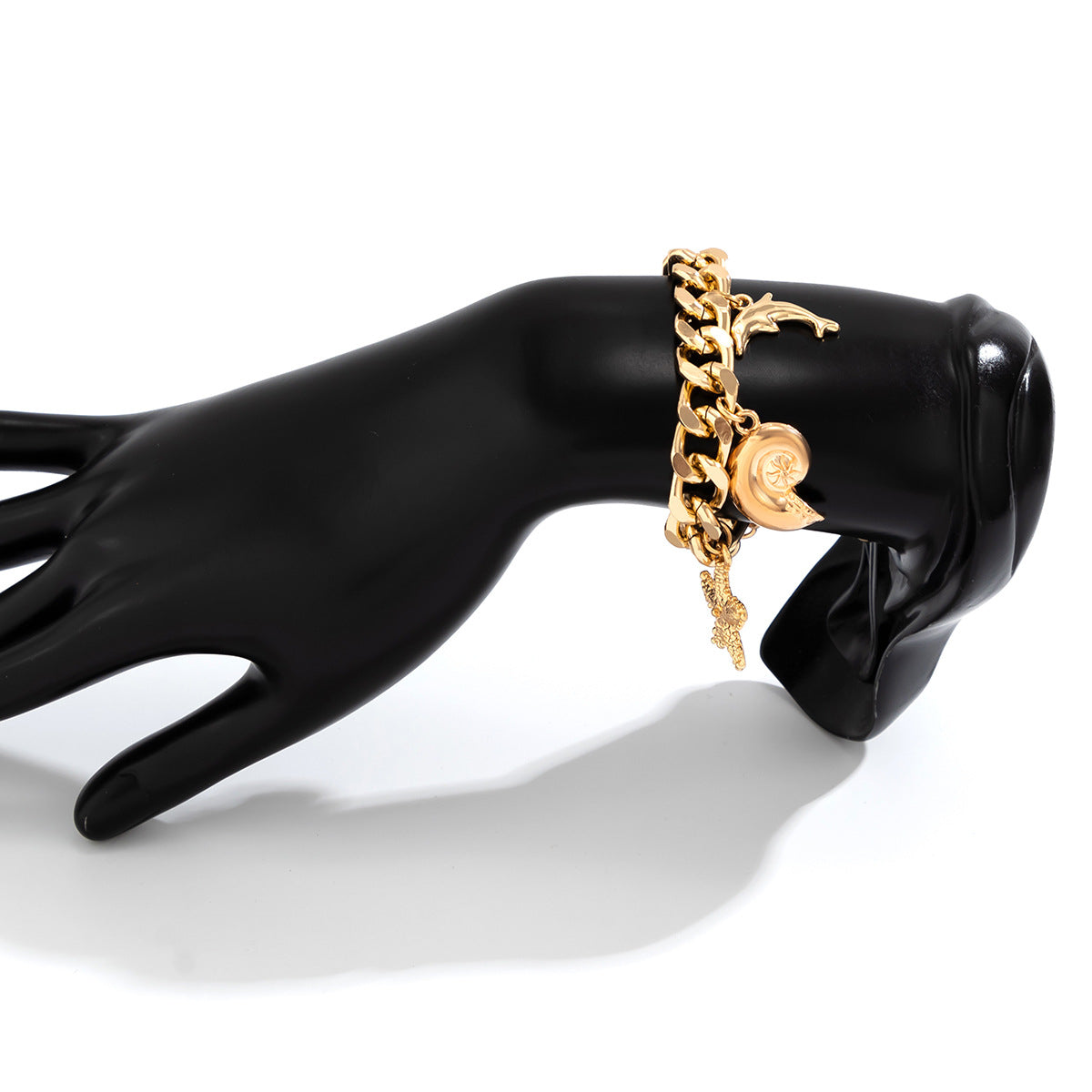 Make waves wherever you go with the Golden Shores Charm Choker—a striking chain necklace adorned with carefully detailed ocean charms. Featuring a starfish, dolphin, shell, and spiral conch, each charm tells a story of beachside serenity and wild wanderlust. Crafted with a chunky gold-tone chain, this piece pairs effortlessly with anything from breezy dresses to edgy urban outfits.