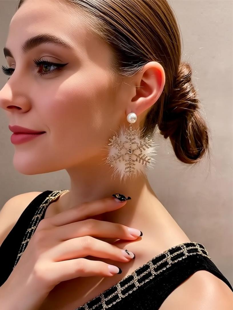Elevate your holiday style with our Elegant Snowflake Zircon Earrings. Featuring sparkling zircon crystals in a delicate snowflake design and a chic pearl accent, these earrings are perfect for adding a touch of glamor to your festive outfits. The soft faux fur trim adds a cozy yet luxurious feel, making them a statement accessory for holiday parties, winter weddings, or any special occasion.
