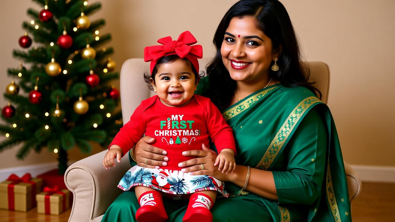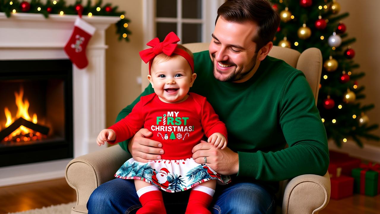- Bodysuit print: “My First Christmas!” with holiday-themed icons