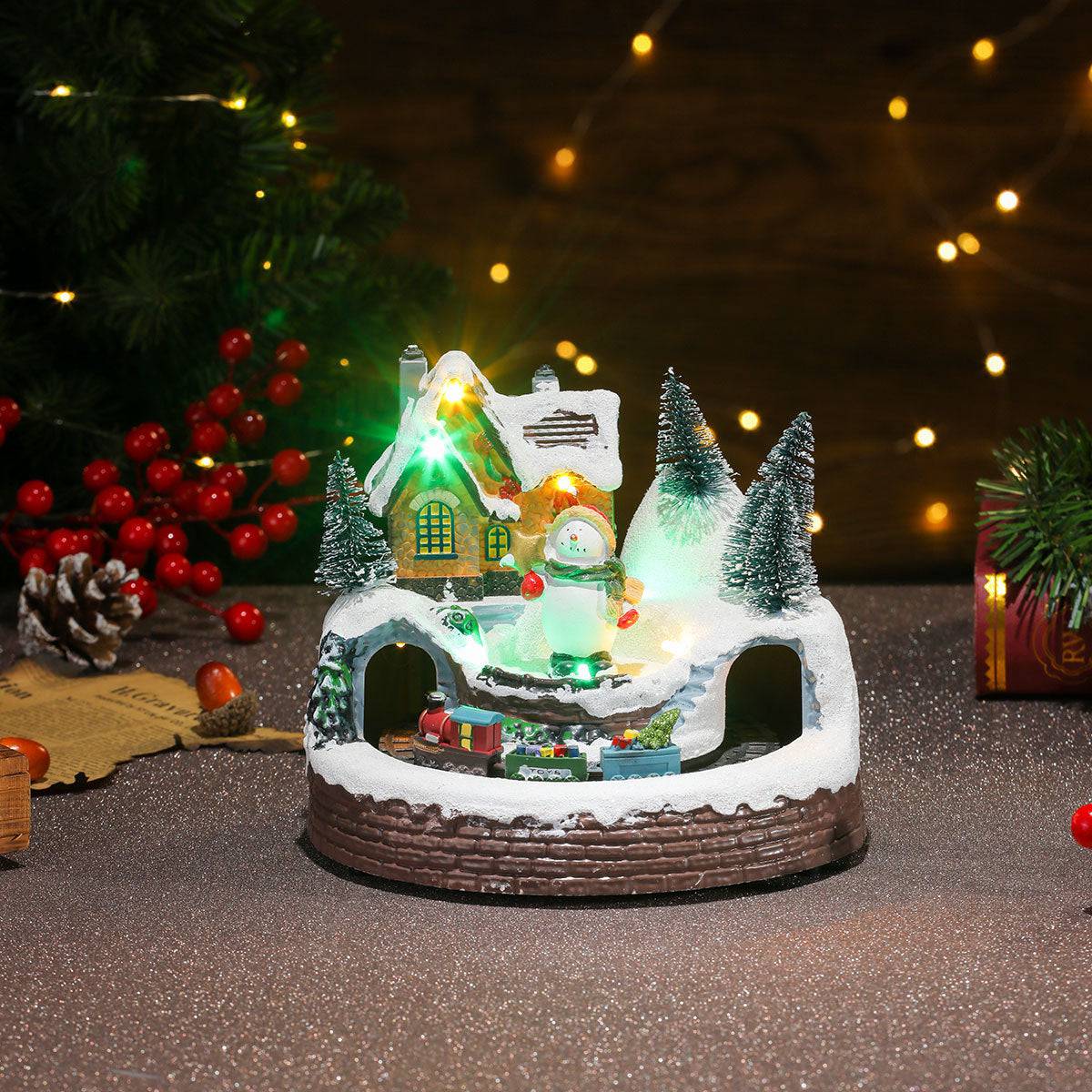 Bring the magic of a winter wonderland into your home with this Rotating Christmas Village Music Box! This enchanting resin ornament features a beautifully detailed snowy village scene, complete with Santa, snow-covered trees, and cheerful holiday colors. With LED lights that add a warm, festive glow and a rotating design, this music box plays a classic Christmas melody, filling your home with holiday spirit. Perfect for decorating mantels, shelves, or tabletops, it’s a delightful keepsake that brings joy and charm to any space.