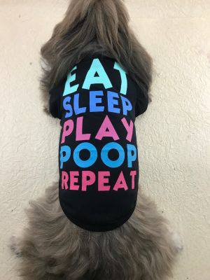 Funny Statement Design: Bold “Eat, Sleep, Play, Poop, Repeat” text captures the life of a happy pet.