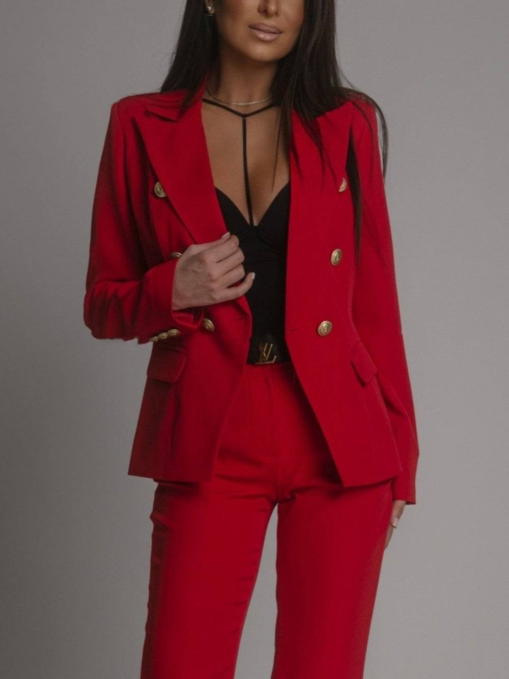 Upgrade your wardrobe with this chic and versatile Women's Double-Breasted Business Suit, designed to make a statement of power and poise. Featuring a tailored fit and premium fabric, this suit is perfect for formal events, office meetings, or a stylish night out. The double-breasted blazer, accented with bold gold buttons, adds a touch of classic sophistication. Paired with straight-leg trousers, this ensemble ensures you look sharp and feel confident.