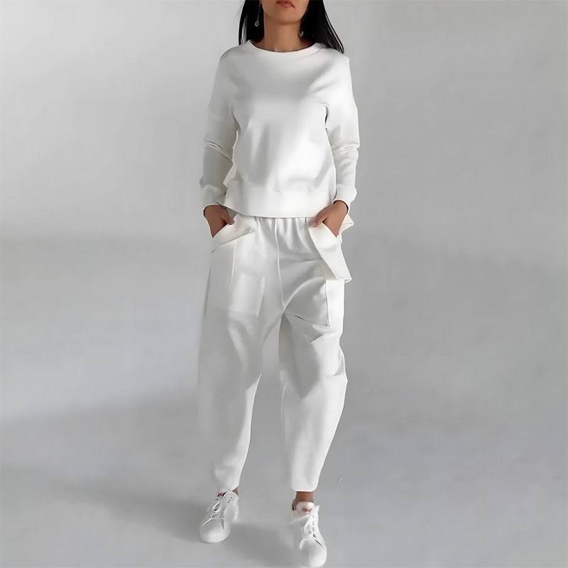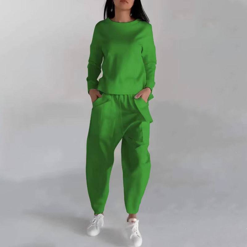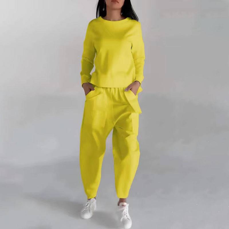 Stay effortlessly chic and comfortable with this Solid Color Fashion Sweatshirt & Loose Trousers Set. Featuring a stylish long sleeve sweatshirt with a trendy back slit and matching loose trousers, this two-piece set is perfect for women who want to blend fashion with comfort. The top comes with convenient pockets, making it functional for everyday wear, while the relaxed-fit trousers provide all-day comfort. Whether you're lounging at home, running errands, or stepping out for a casual outing, this versatile set is a must-have in your wardrobe.